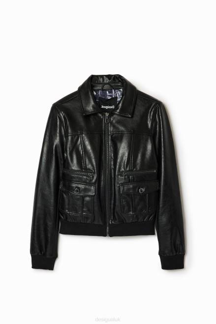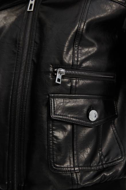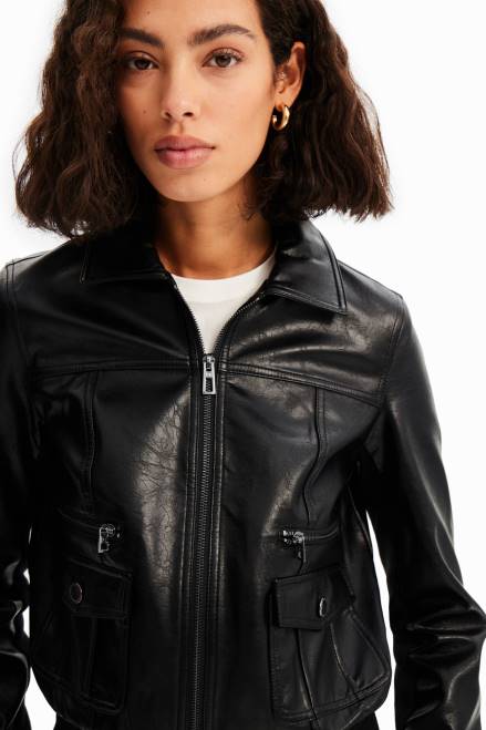 A plain leather-effect PU jacket in a retro style, with four pockets and long sleeves with cuffs and a button.