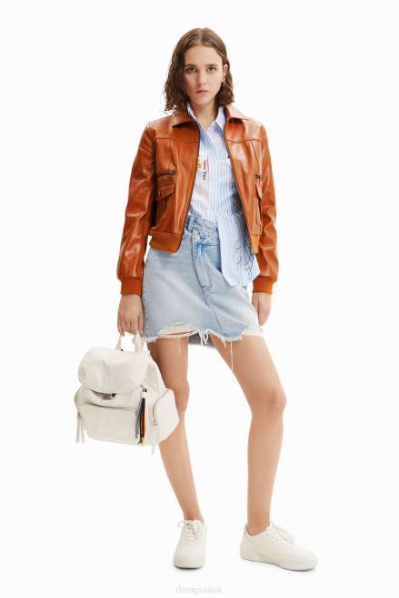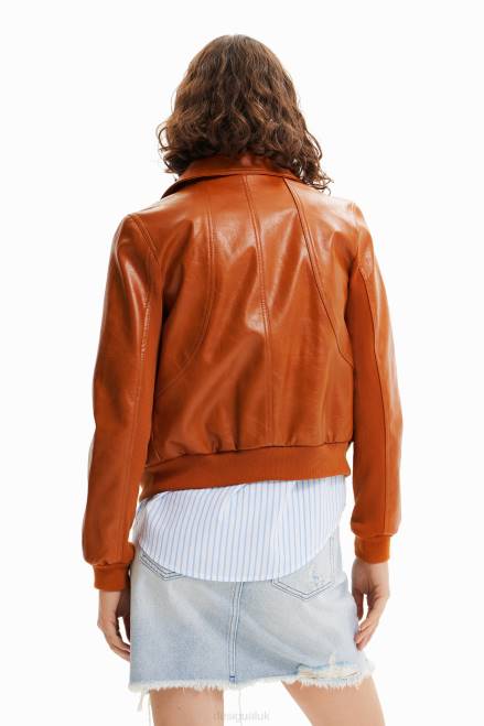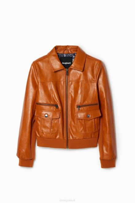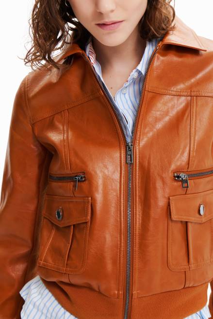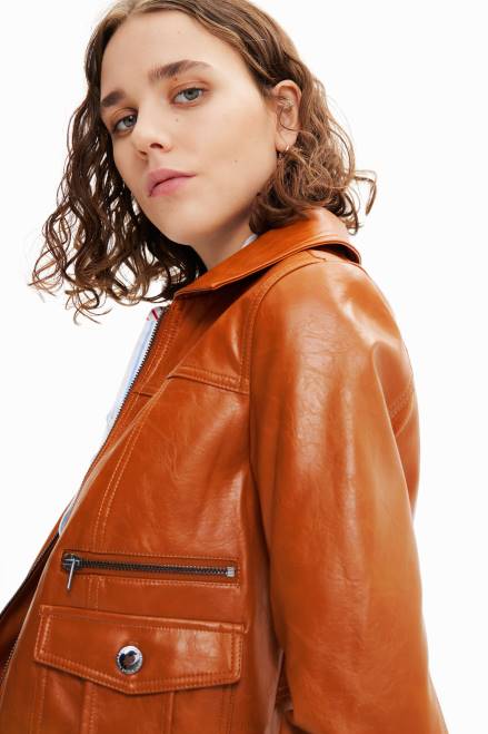 A plain leather-effect PU jacket in a retro style, with four pockets and long sleeves with cuffs and a button.