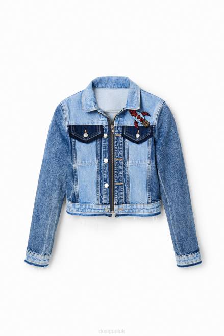A short, denim, trucker-style jacket that combines pieces in different fabrics and washes, featuring an embroidered brooch detail.