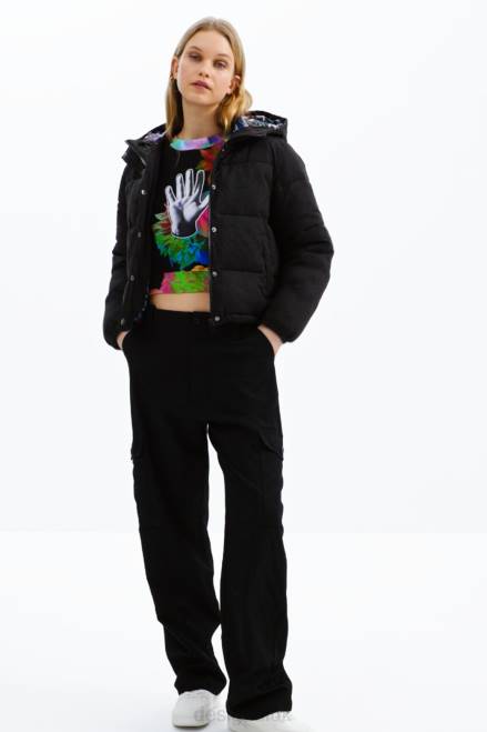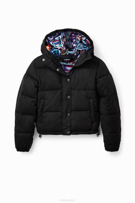 A short padded jacket in embroidered cotton fabric, with a hood, double closure and adjustable elasticated hem.