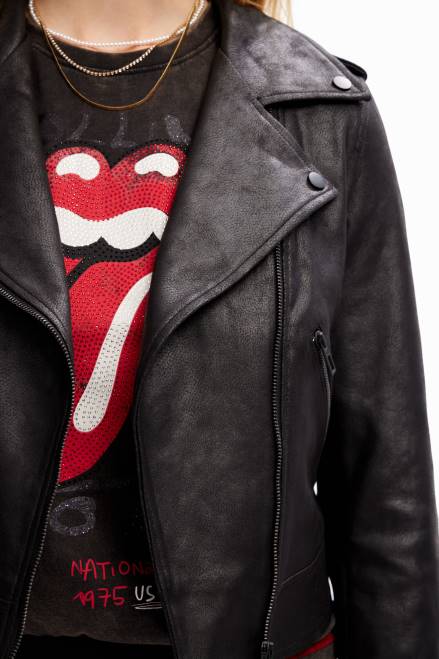 A fitted biker jacket in leather-effect fabric with a distressed finish. Featuring a lapel collar, pockets and a crossover zip fastening.