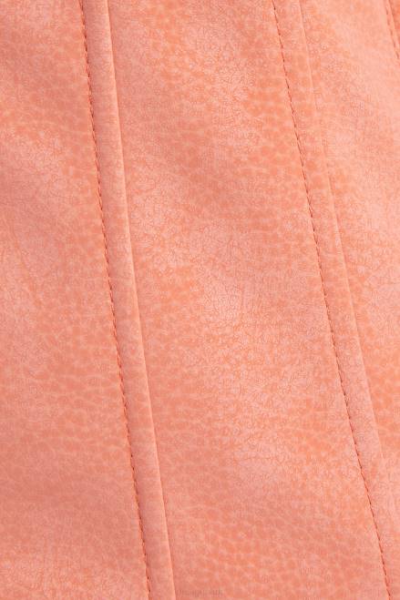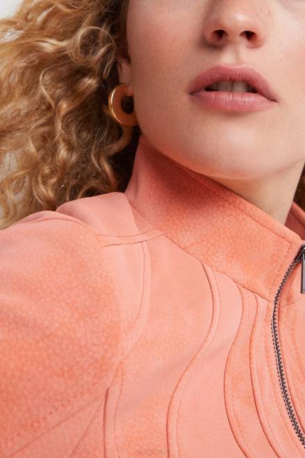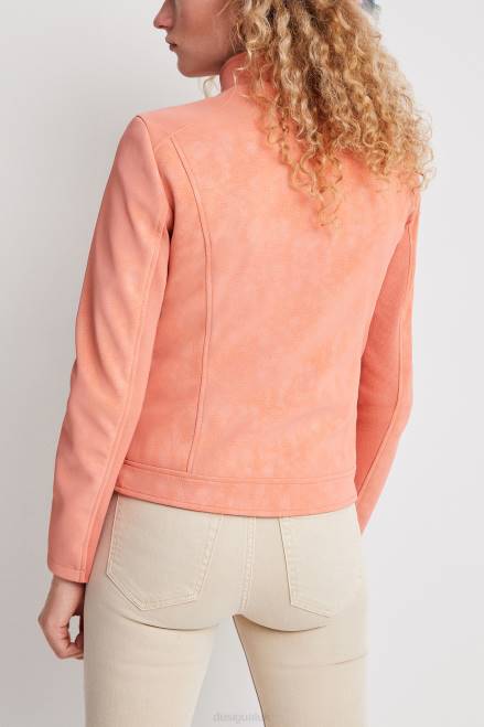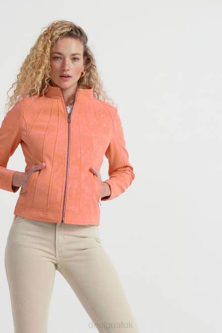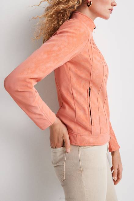 Decorative seams and a medium collar on a fitted biker jacket made from recycled polyester. With a craquelure effect and a very soft feel that's reminiscent of peach skin.