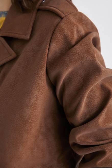 Elegant and lightweight, this jacket features a craquelure effect and a very soft, peach skin-like feel. With a zip fastening, it can also be cinched at the waist. Made from recycled fibres.