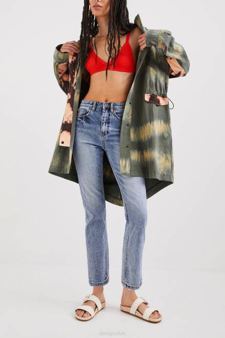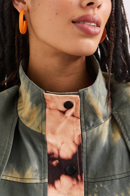 Tie-dye patchwork in greens, blue and pink on a sustainable-cotton trench coat. Has a belt to adjust it at the waist, plus a medium collar and hood. ''Life is awesome'' embroidery on the back.