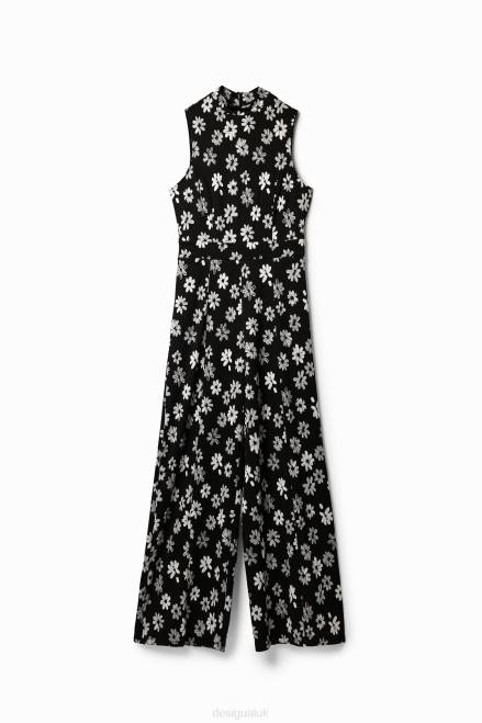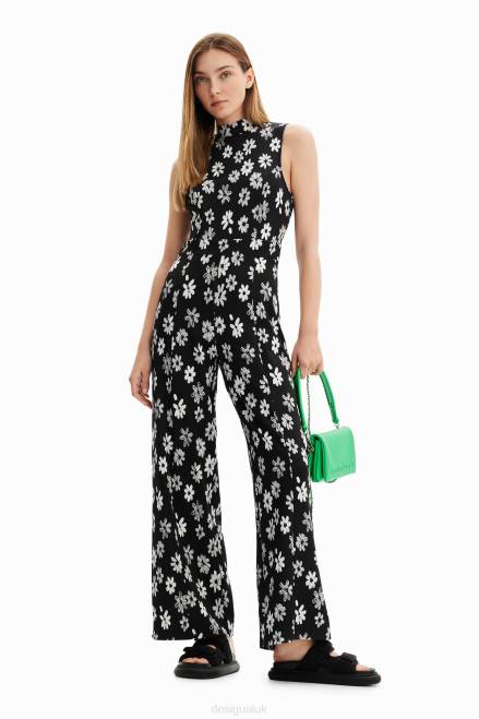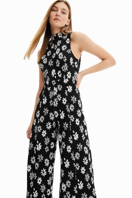 A sleeveless, fitted jumpsuit with wide legs and central seams in a stretch fabric featuring arty flowers.