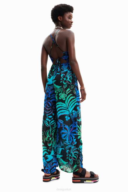 A long, wide-leg jumpsuit with a smock-stitch body, a cut-out and straps that cross at the back. Featuring a multicoloured tropical print.