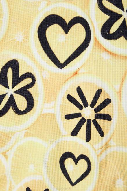 A swimsuit with straps featuring an illustration print on a lemon slice background.