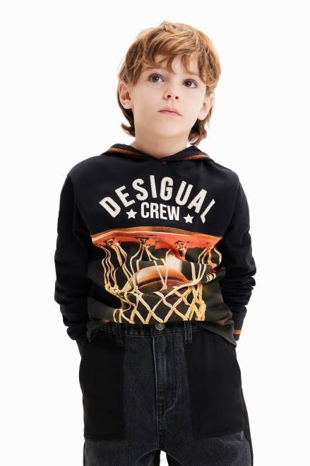 A long-sleeve hooded T-shirt with an embroidered front logo and photographic basketball print.