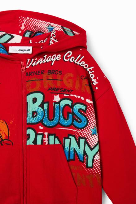A zip-up hoodie with a print of Bugs Bunny illustrations in a distressed effect.