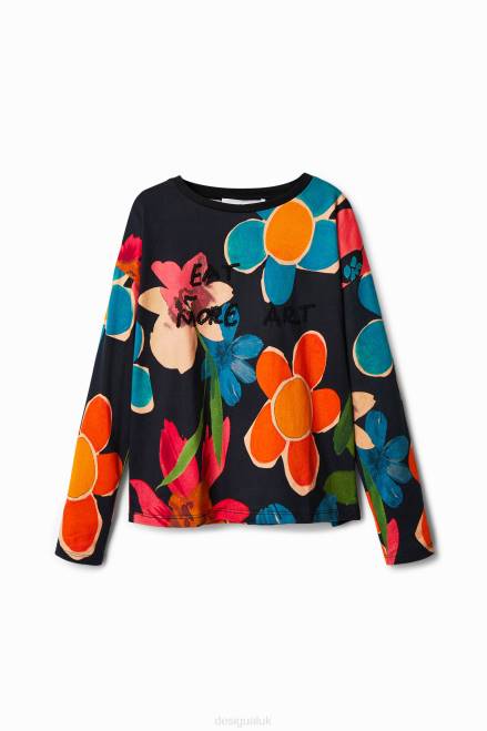A cheerful long-sleeve T-shirt with an all-over floral print and the message ''Eat More Art'' embroidered in sequins on the chest.