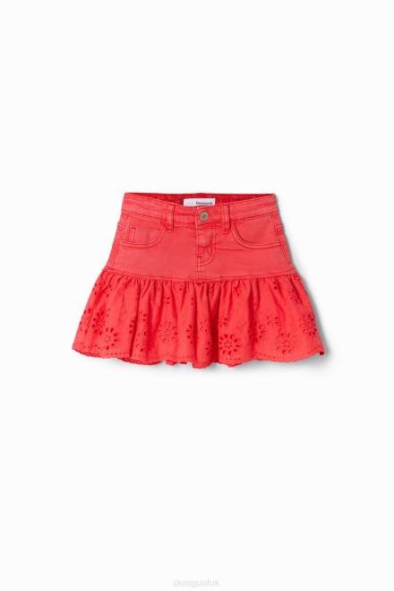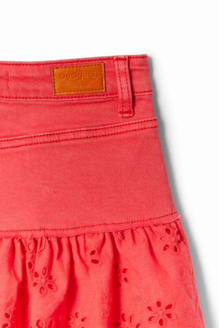 A denim mini skirt with a washed effect, frayed details and a ruffle in fine fabric with Swiss embroidery.