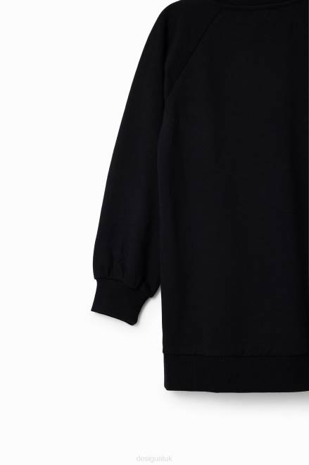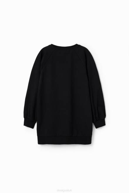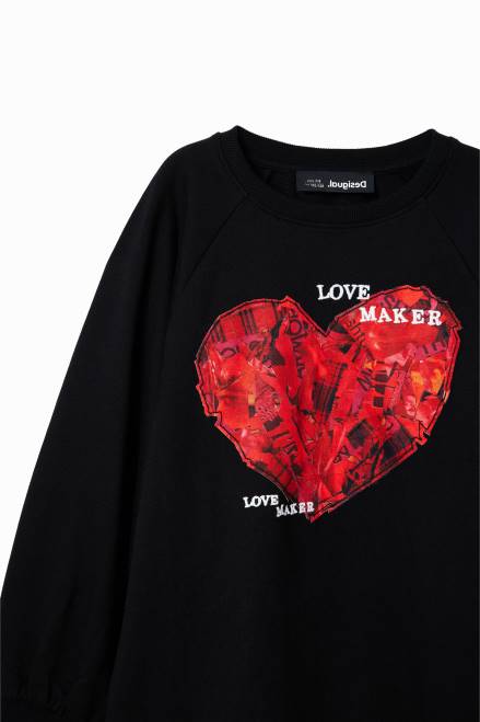 A short sweatshirt dress with long puff sleeves and a front heart patch with embroidered messages.