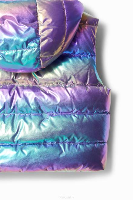 A short padded gilet with a hood that will dazzle young and old with its playful iridescent effect.