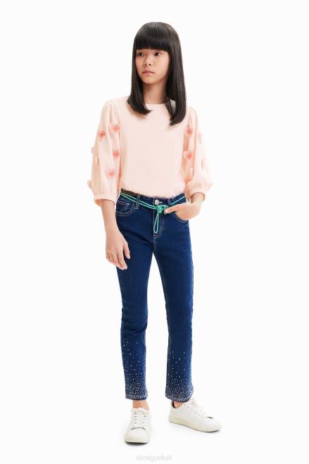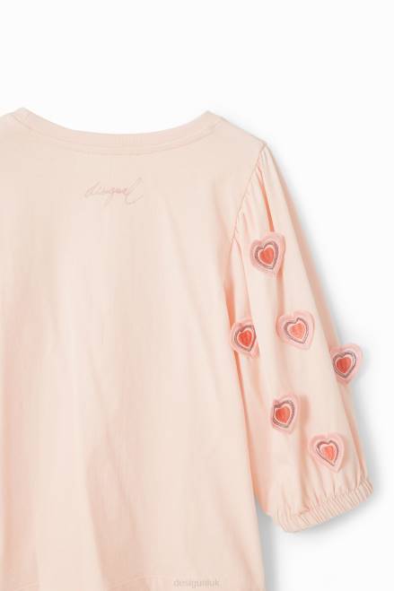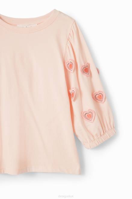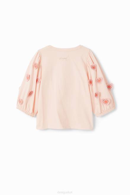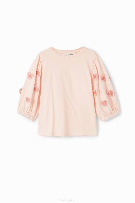 A T-shirt with 3/4 puff sleeves with gathering and heart patches.