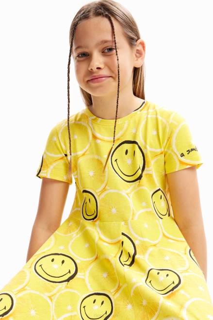 A short-sleeve dress with a Smiley print on a lemon slice background.