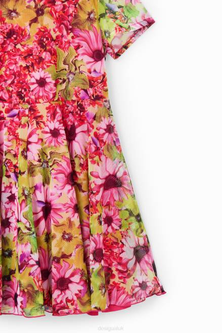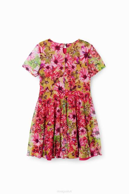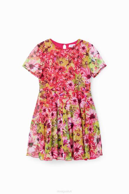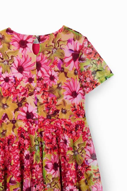 A short tulle dress with short sleeves, an opening on the back and a floral print.