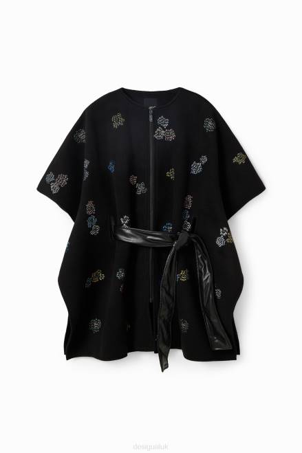 An oversize poncho that's open at the sides with a leather-effect belt and zip fastening. In wool-style fabric with floral embroidery.