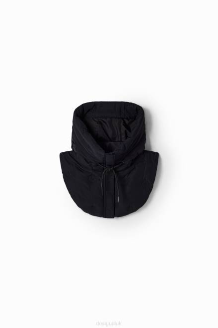 A quilted hood with a collar covering the chest, a zip and tone-on-tone geometric embroidery.