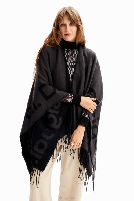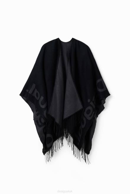 An oversize open reversible poncho in two-tone fabric with a contrasting logo and fringing on the hem.