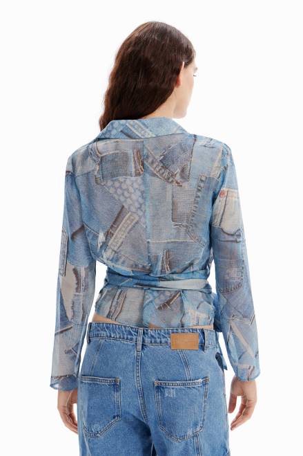 A long-sleeve wrap blouse with a lapel collar, tie belt and chiffon fabric with a patchwork print.