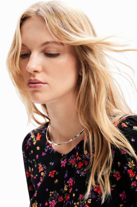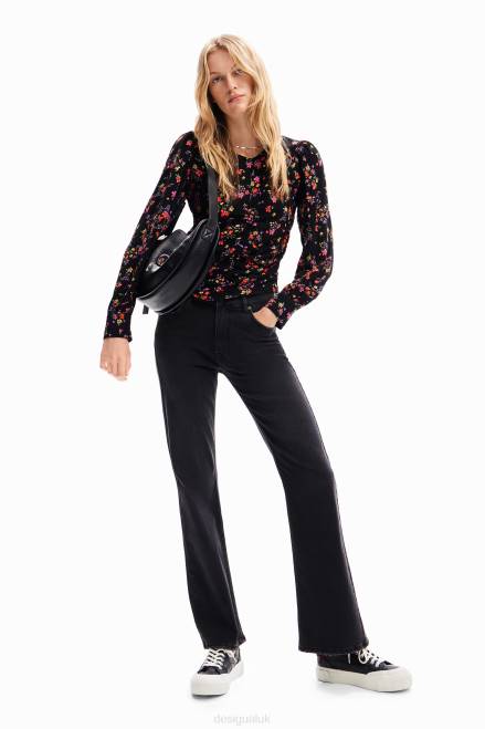 A blouse with a round neckline, long puff sleeves, gathering on the centre and sides and a floral print.