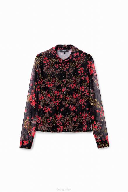 A fitted shirt in stretch tulle with long sleeves, gathering under the bust and a floral print.
