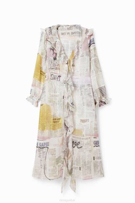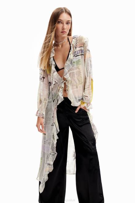 A long chiffon blouse with long sleeves and a V-neckline with ruffles and ties. Featuring a newspaper print.