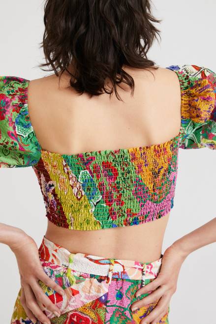 A cropped and elastic, fresh and casual blouse in a seersucker fabric with balloon sleeves, featuring a combination of upholstery print and sustainable cotton. Can be worn strapless or with a square neckline.