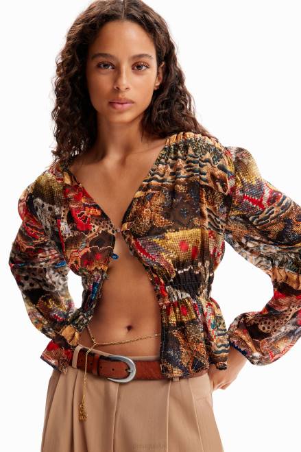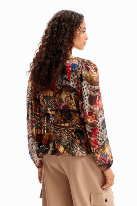 A V-neck blouse with long sleeves, a ruffle-effect hem, plumetis-effect fabric and a tapestry print. Designed by M. Christian Lacroix.
