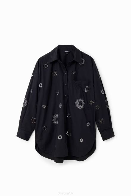 An oversize long-sleeve shirt with a front pocket and poplin fabric with metallic embroidery.
