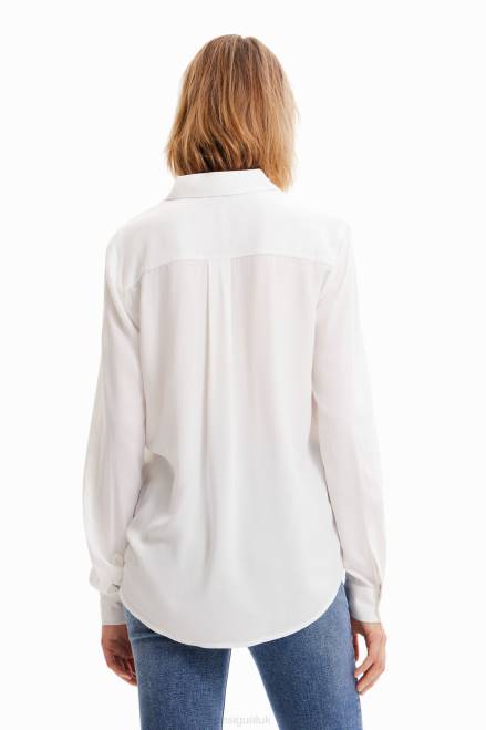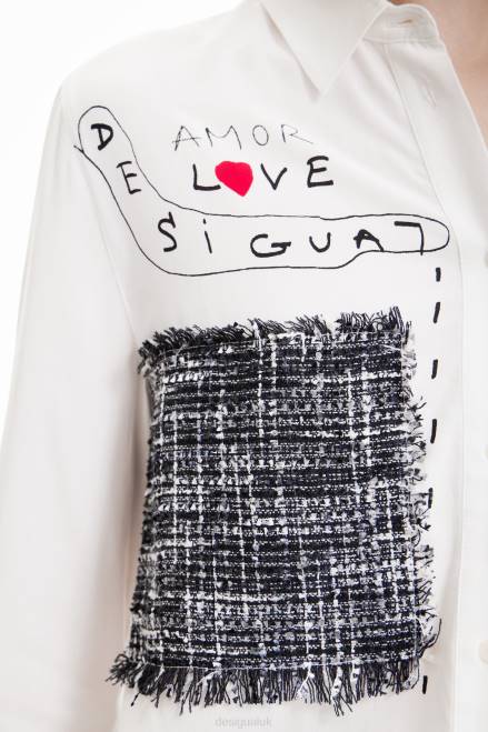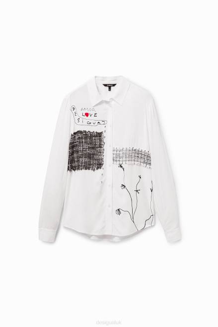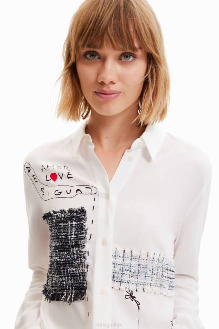 A white shirt featuring Chanel-style patchwork bands and a hand-drawn floral print. Made from eco-friendly viscose. Lettering and raw-cut details.