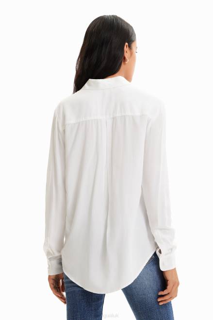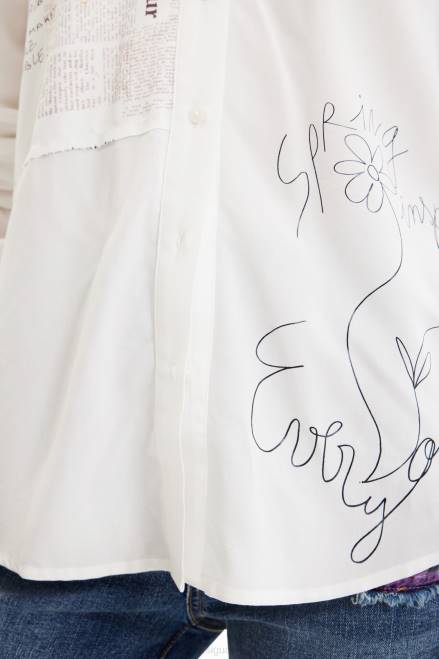 A long-sleeve shirt with a frayed patch, illustrations and messages on the front.