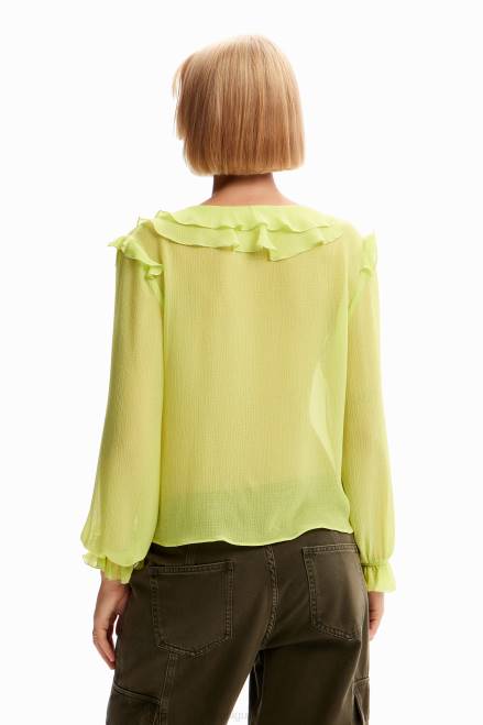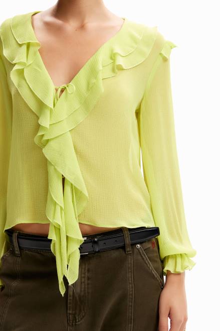 A long-sleeve, V-neck blouse with ruffles and ties in a textured fabric.