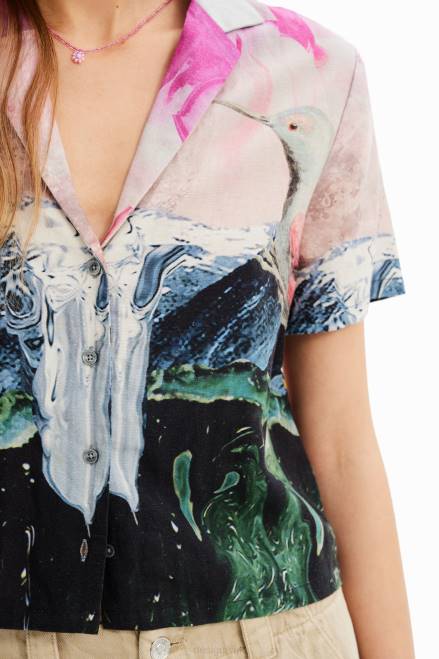 A short loose-fitting resort-style shirt with short sleeves and a fantasy print.
