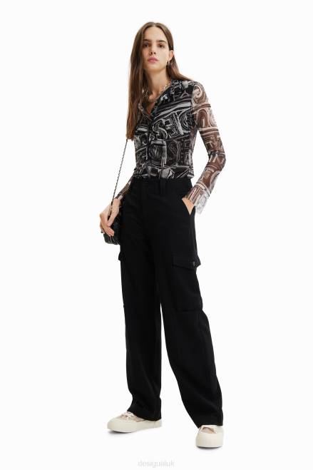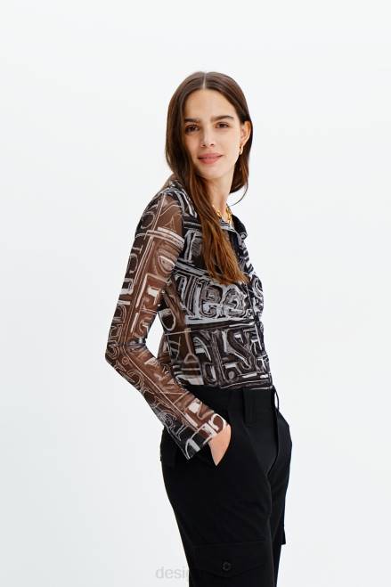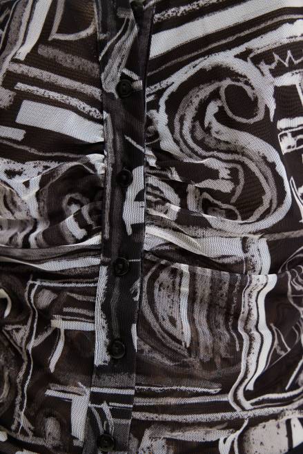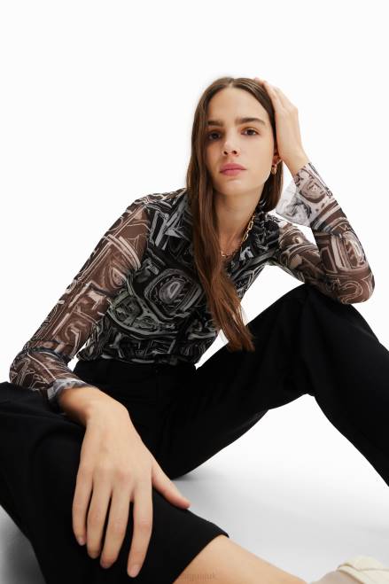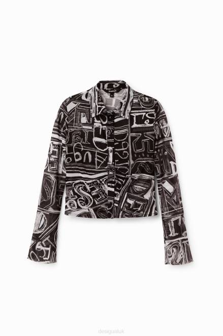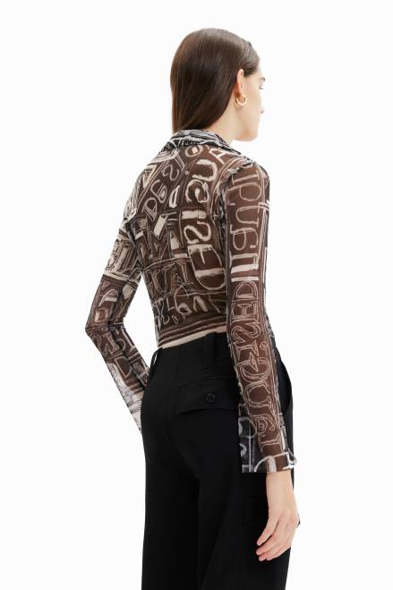 A short fitted tulle shirt with long sleeves, gathering under the bust and a print by designer Javier Mariscal.