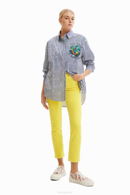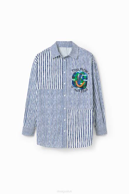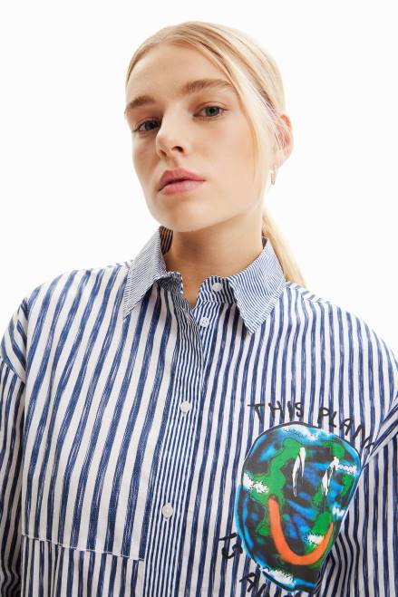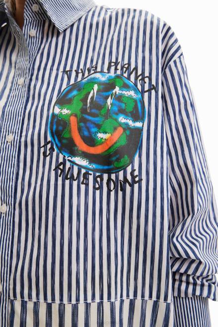 A long-sleeve shirt in a striped patchwork with an earth illustration and message detail on the front.
