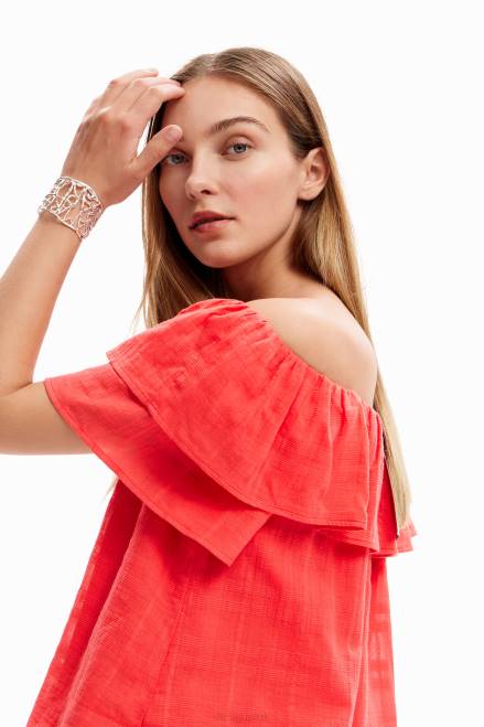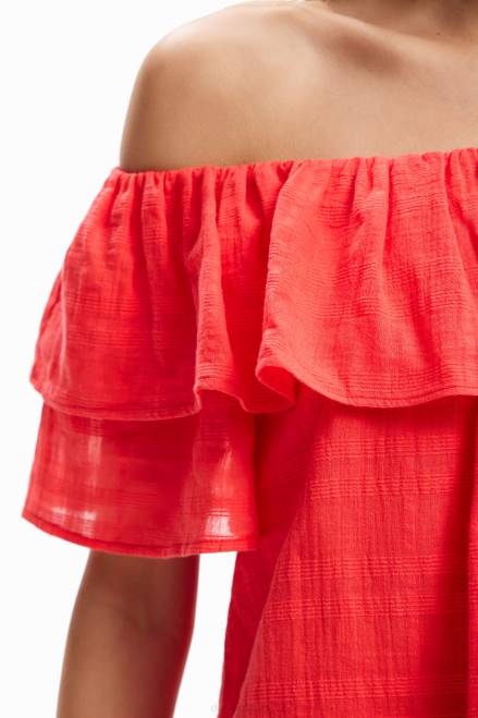 A short-sleeve blouse with a ruffle on the neckline, exposed shoulders and crinkle-texture fabric.