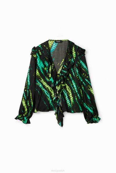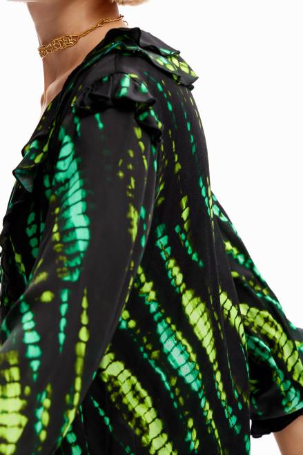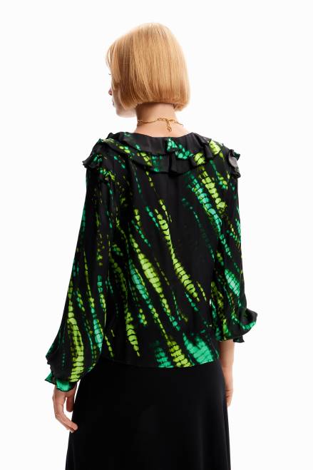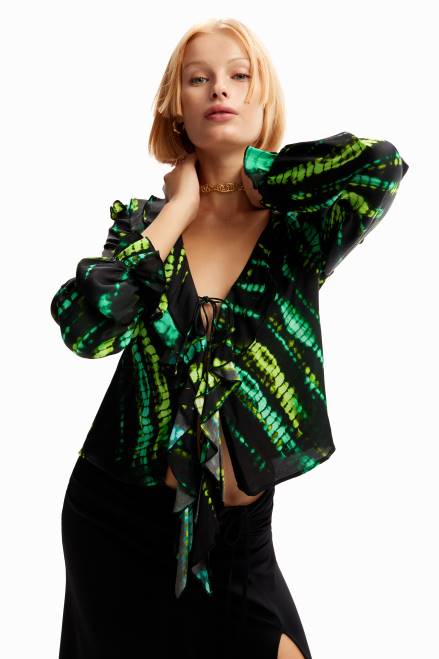 A long-sleeve, V-neck blouse with ruffles, ties and satin tie-dye print fabric.