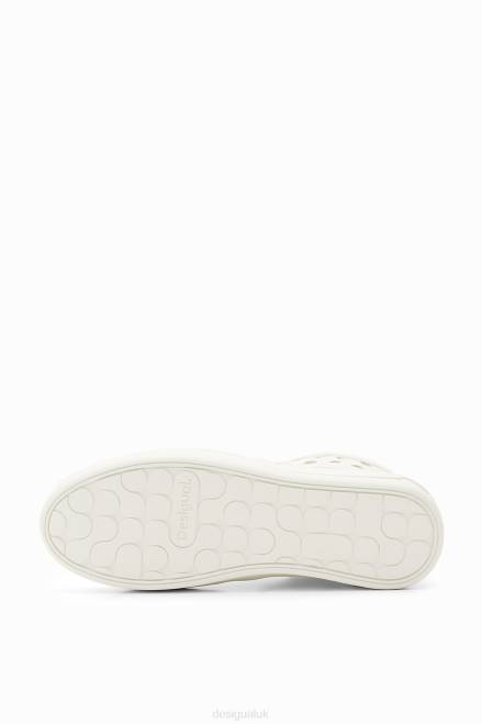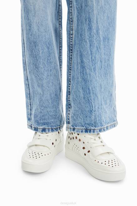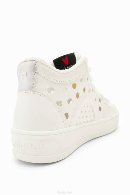 High-top platform sneakers in patent-effect fabric with die-cut circles of different sizes. Featuring velcro straps at the bottom of the tongues.
