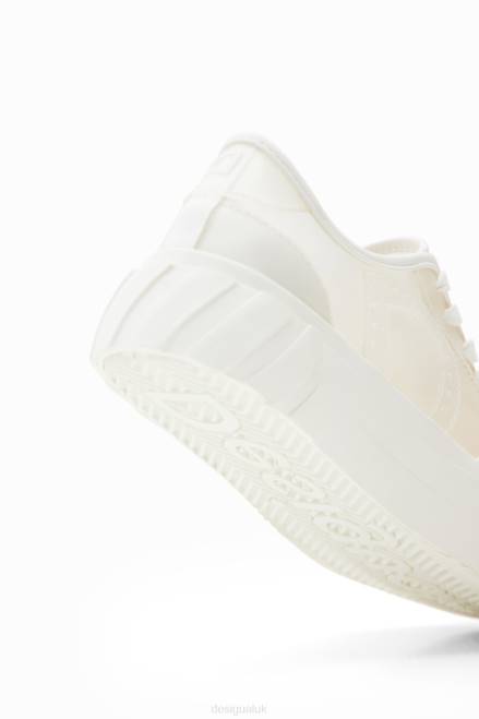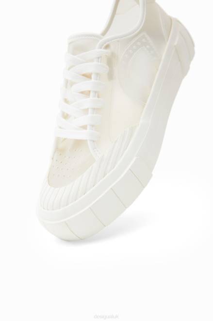 Low-top platform sneakers with a rubber toe and a transparent upper with die-cut holes on the sides and front.