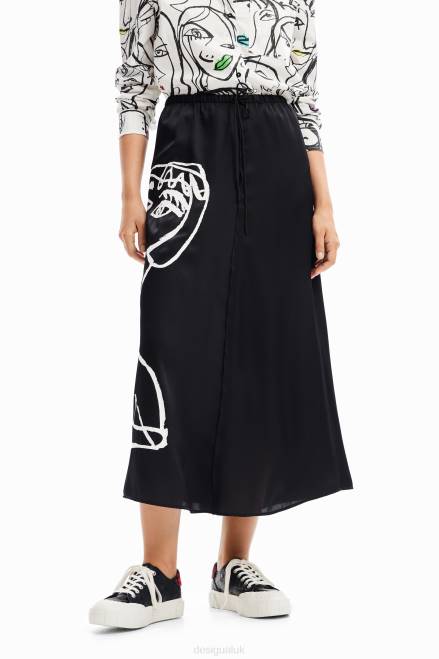 A midi skirt in flowing satin fabric with an arty face print on the front, designed by Javier Mariscal.