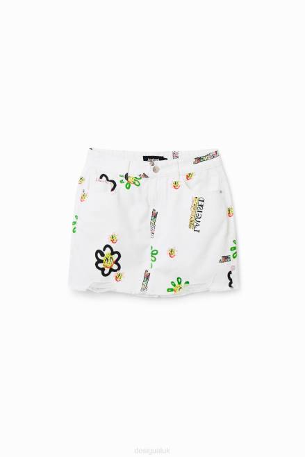 A denim mini skirt with a print of flowers and suns.