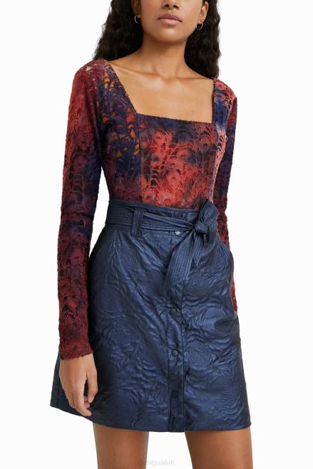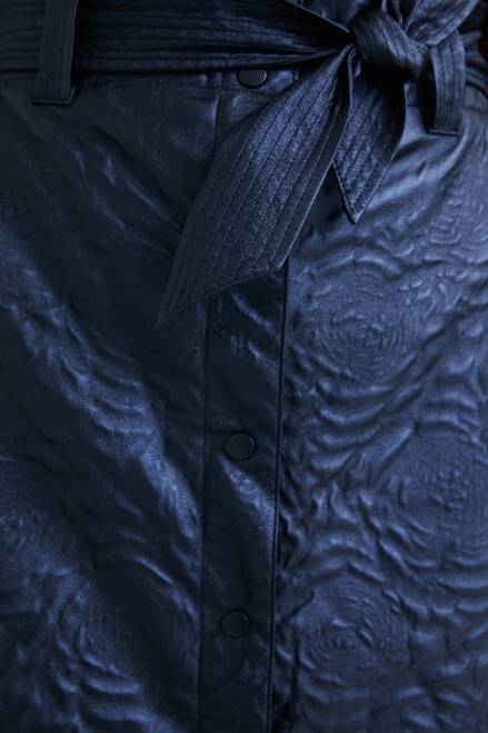 The floral embossing that adorns this slim mini skirt with front hook-and-eye closure has a textured touch . Includes a matching bowknot belt in the same fabric.