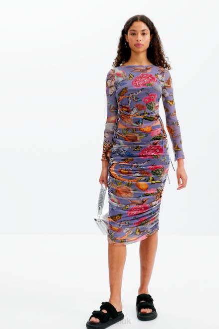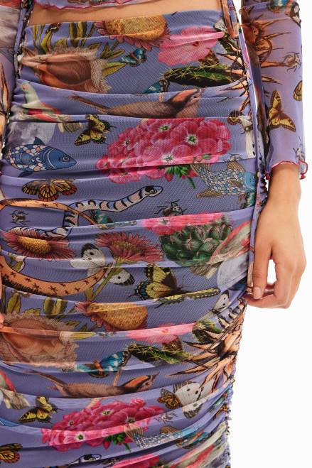 A fitted midi skirt in draped ruched tulle with an animal and plant print.