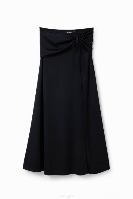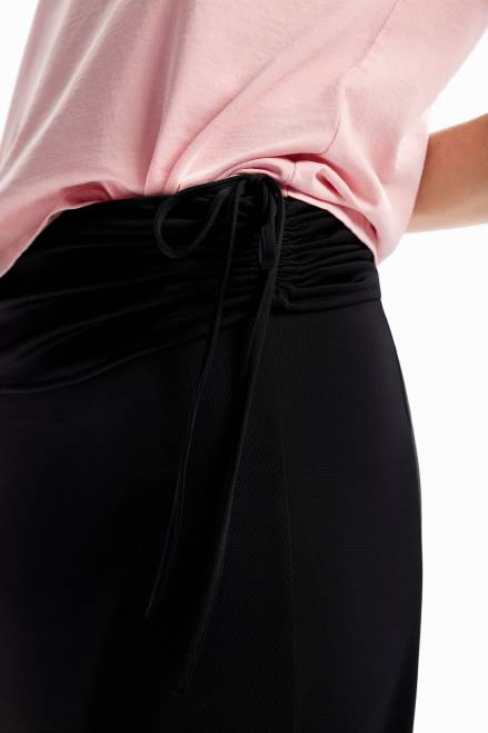 A stretch midi skirt with a front slit and adjustable gathering with ties at the waist.