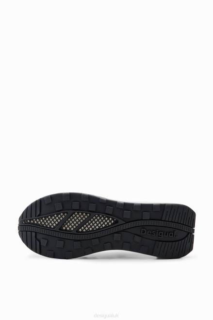 Running-style sneakers with a patchwork of different fabrics, split leather and a newspaper clipping print.