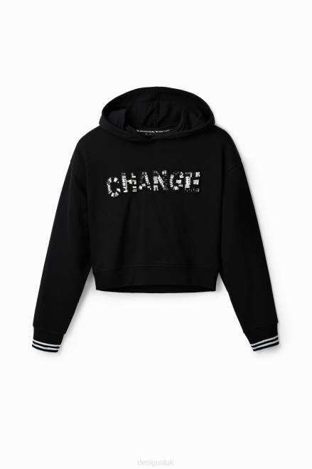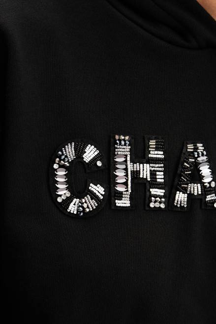 A short hoodie with long sleeves and a front message in embroidered patches with beads.