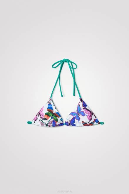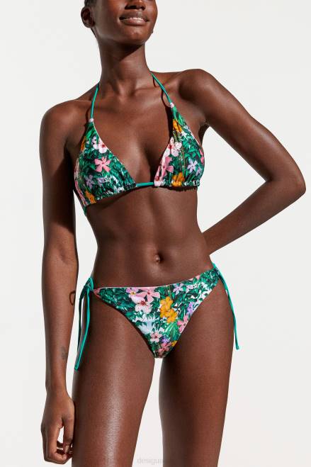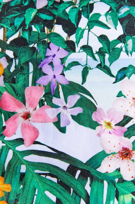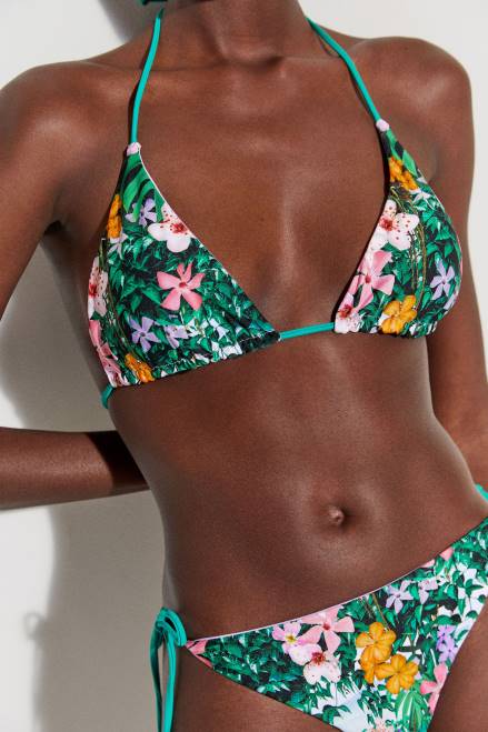A floral and plant-life print on a curtain bikini top in green tones made from recycled polyamide.