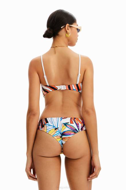A bandeau bikini top with thin adjustable straps and back fastening. Featuring a multicoloured tropical print.