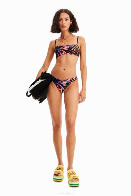 A bandeau bikini top with thin adjustable straps and back fastening. Featuring a multicoloured tropical print.